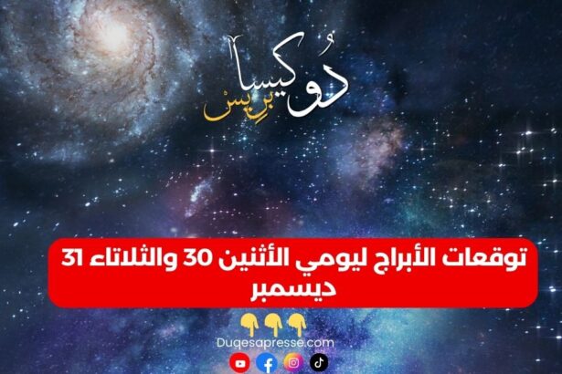 أهلا بكل متابعين موقع وصفحة دوكيسا بريس توقعات جميع الأبراج ليوم الأثنين 30 والثلاثاء 31 ديسمبر ونغلق سنة بولادة قمر…