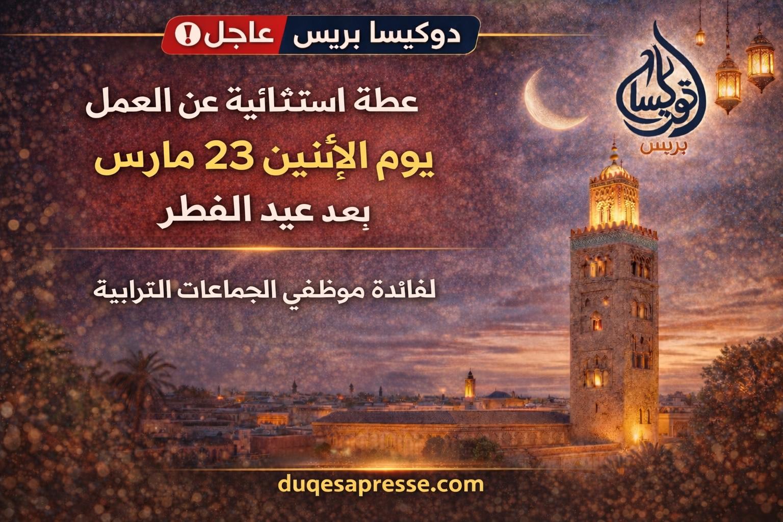 أعلنت الحكومة عن إقرار عطلة استثنائية عن العمل يوم الإثنين 23 مارس لفائدة موظفي الإدارات العمومية والجماعات الترابية، وذلك بمناسبة عيد الفطر المبارك ويُنتظر أن يشمل هذا القرار موظفي الإدارات…