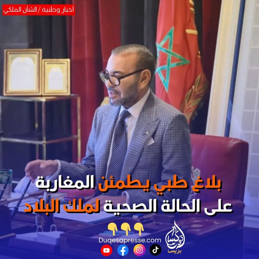 تعرض ملكنا الغالي محمد السادس لوعكة صحية تستدعي الخضوع لعلاج طبي وفترة راحة وظيفية مؤقتة، حسب ما أعلن عنه طبيبه الخاص.