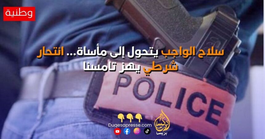 عاشت مدينة تامسنا عصر اليوم على وقع حادث مؤلم، بعدما أقدم شرطي يعمل بالمنطقة الأمنية على وضع حدّ لحياته باستعمال سلاحه الوظيفي داخل مقر عمله، في واقعة هزّت زملاءه وكل من عايش اللحظات الأولى للحادث.