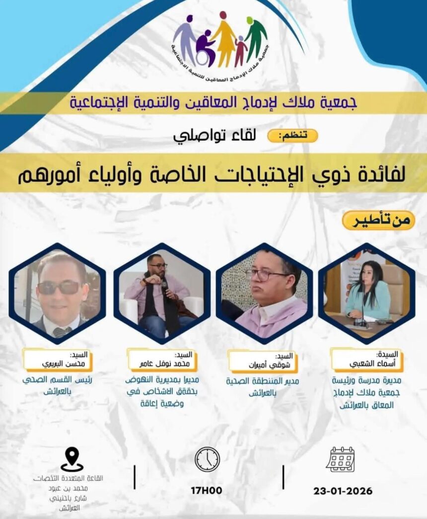 في خطوة تعكس التحول من منطق الخطاب إلى منطق الفعل، تحتضن مدينة العرائش لقاءً تواصليًا نوعيًا يُوجَّه مباشرة إلى صلب انشغالات ذوي الاحتياجات الخاصة وأسرهم، بمبادرة من جمعية ملاك لإدماج المعاقين والتنمية الاجتماعية، في موعد إنساني يراهن على الإنصات، التوضيح، وبناء جسور الثقة.