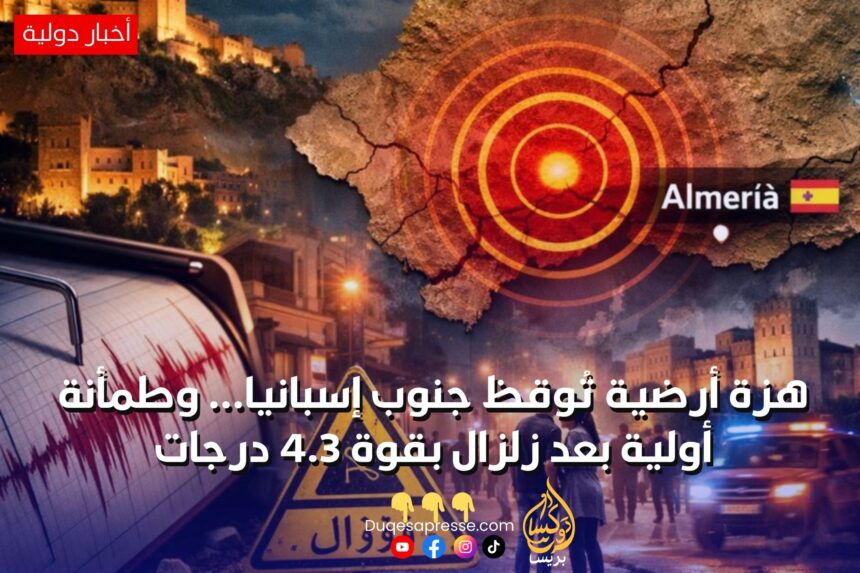 استفاقت مناطق واسعة من جنوب إسبانيا، على وقع هزة أرضية بلغت قوتها 4.3 درجات على سلم ريختر، سُجل مركزها قرب بلدة تابيرناس التابعة لمقاطعة ألميريا.