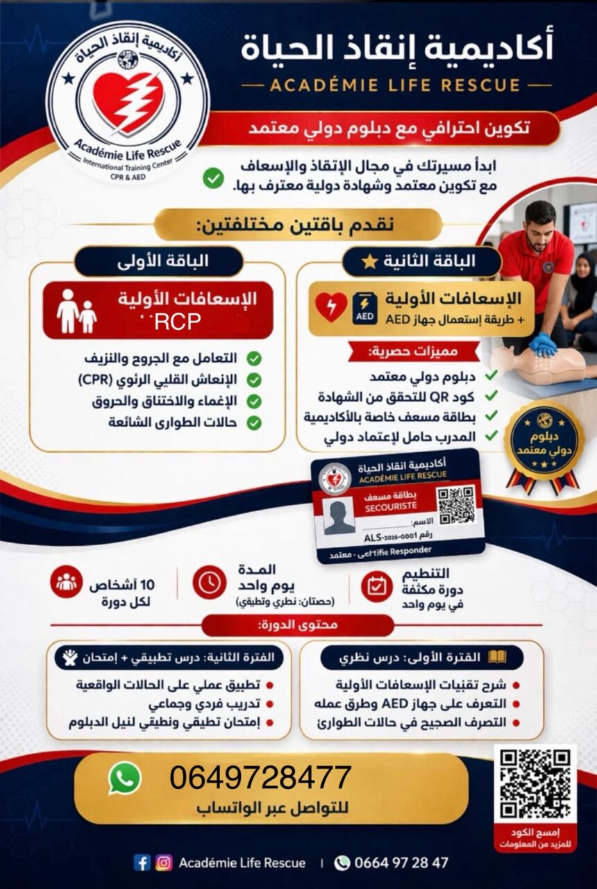 تعلن أكاديمية إنقاذ الحياة (Académie Life Rescue) عن انطلاق دورة تكوينية احترافية في الإسعافات الأولية، مع اعتماد دولي وشهادة موثوقة ✔️ رفقة كوتش محترف و صاحب خبرة طويلة ومعتمد دوليا .